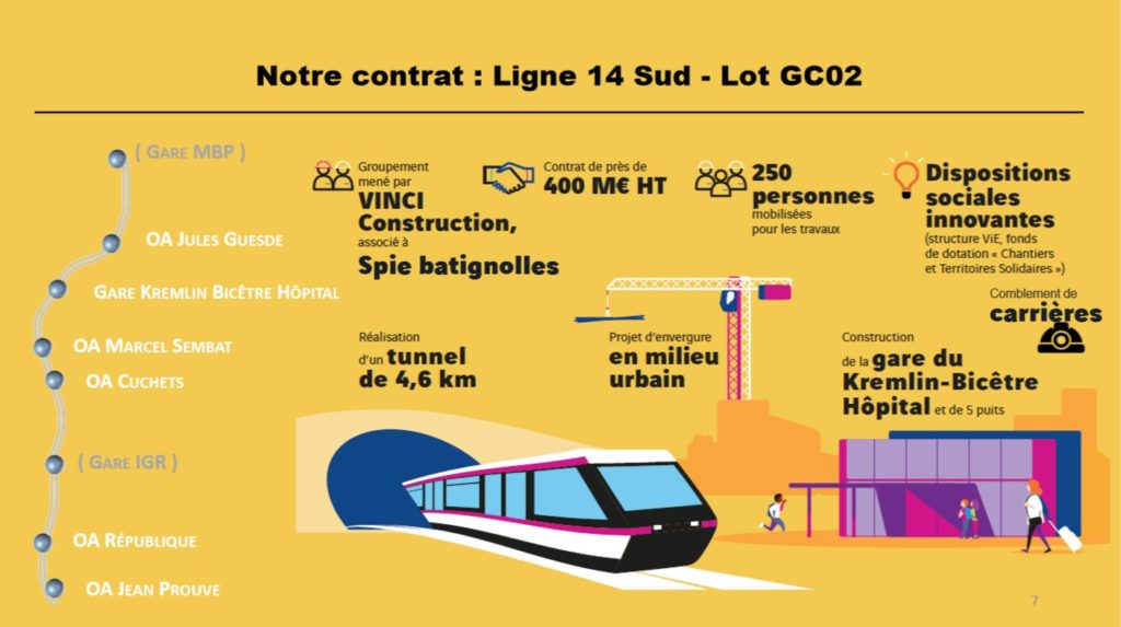 Le présent marché s’inscrit dans le cadre du projet de réalisation de l’infrastructure de transport pour le nouveau tronçon du réseau de transport public du Grand-Paris consistant dans le cadre du présent marché à prolonger la ligne 14 d’Olympiades à Aéroport d’Orly (14,4 km de tunnel).