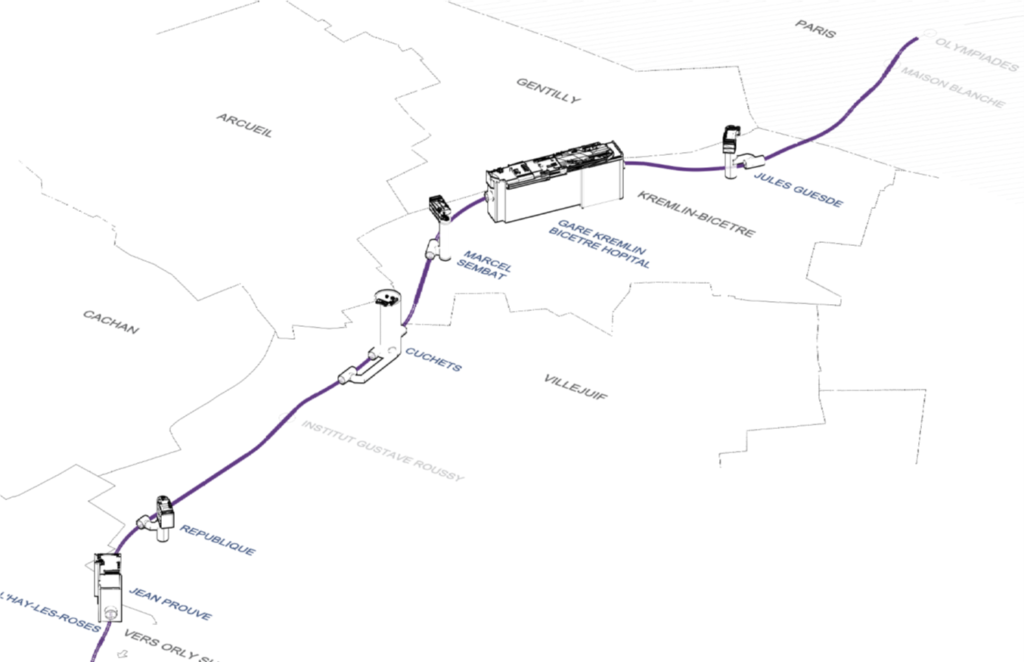Il s’étend de l’ouvrage annexe Jean Prouvé (puits d’entrée du tunnelier) à la gare Maison Blanche – Paris XIIIe (puits de sortie).